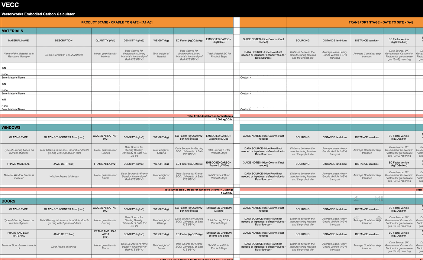 That’s where the Vectorworks Embodied Carbon Calculator (VECC) comes in — it's a custom worksheet that's pre-formatted to help calculate embodied carbon levels of a project. This blog will offer some details about the worksheet and provide you a link to download the file to use yourself.