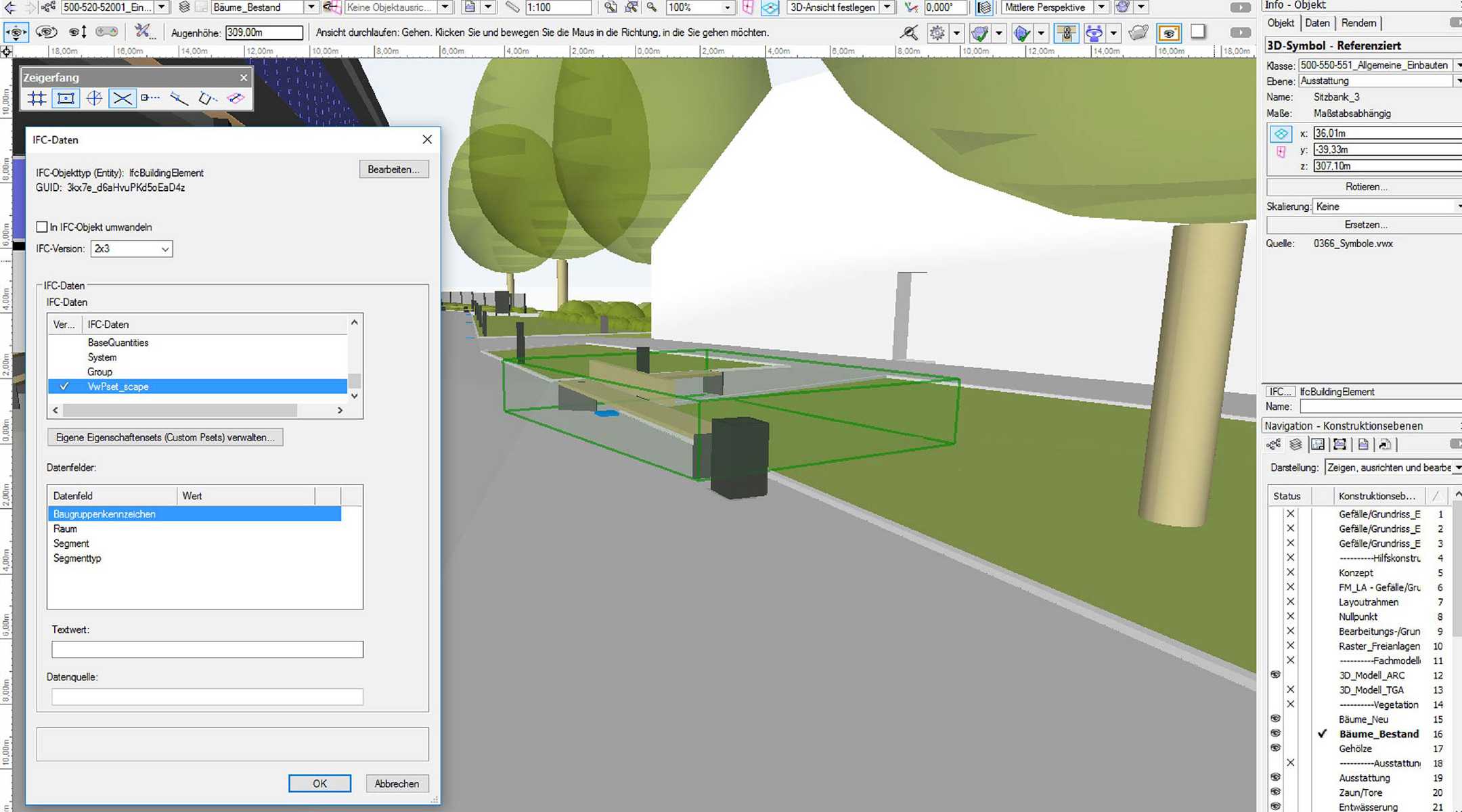 Once the modeling standards were agreed upon by all collaborators, they were then implemented in Vectorworks to guarantee a complete integration of the BIM landscape model via the IFC export into the BIM coordination model. The BIM coordination model and the BIM central database were then managed in BIM collaboration software. The scape Landschaftsarchitekten office used DESITE MD, which performs similarly to BIM collaboration programs such as Solibri, Navisworks, and BIM 360. After scape Landschaftsarchitekten overcame this initial hurdle, all further BIM processes of modeling, plan creation, attribution, scheduling etc. could be accounted for. This general workflow is the same or comparable to the rest of the project team.