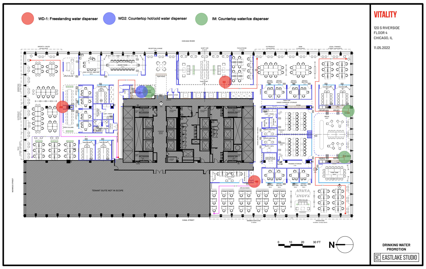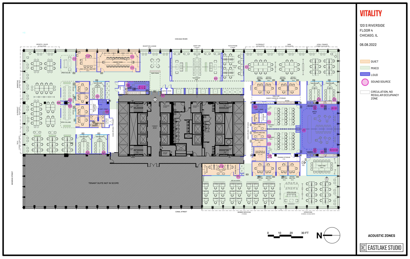 As part of the WELL certification submission, geniant + Eastlake Studio created several diagrams, including the distance of working spaces to exterior windows, walking distance to drinking water sources, and the quiet and loud zones.