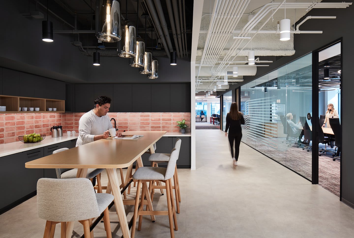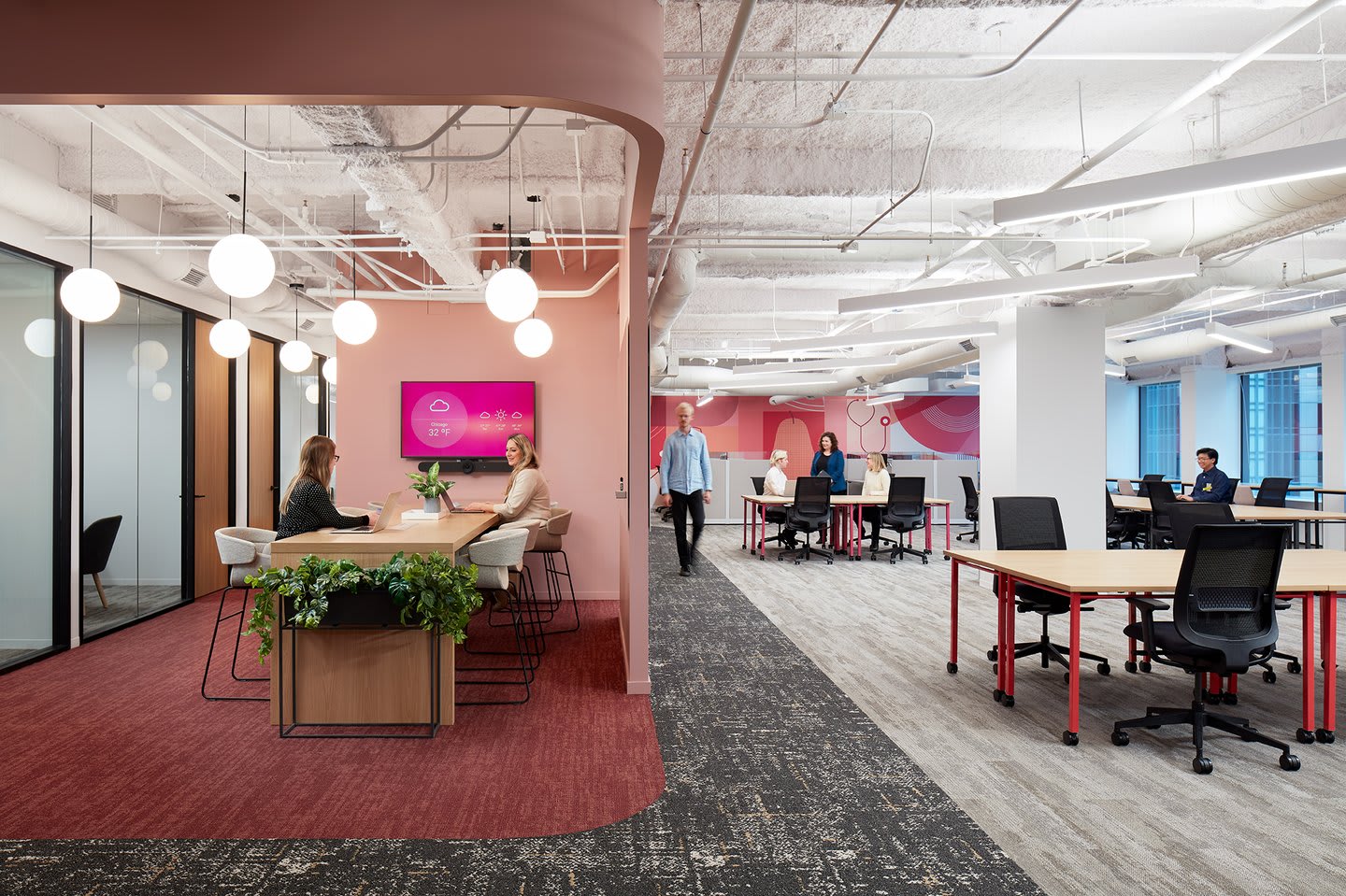 Primary working areas were located within 20 feet of windows to provide natural light, and considerations were made for noise sources to keep sound out of quiet zones, using distance and acoustically absorbent materials such as k13 acoustic spray applied on the exposed ceiling structure.