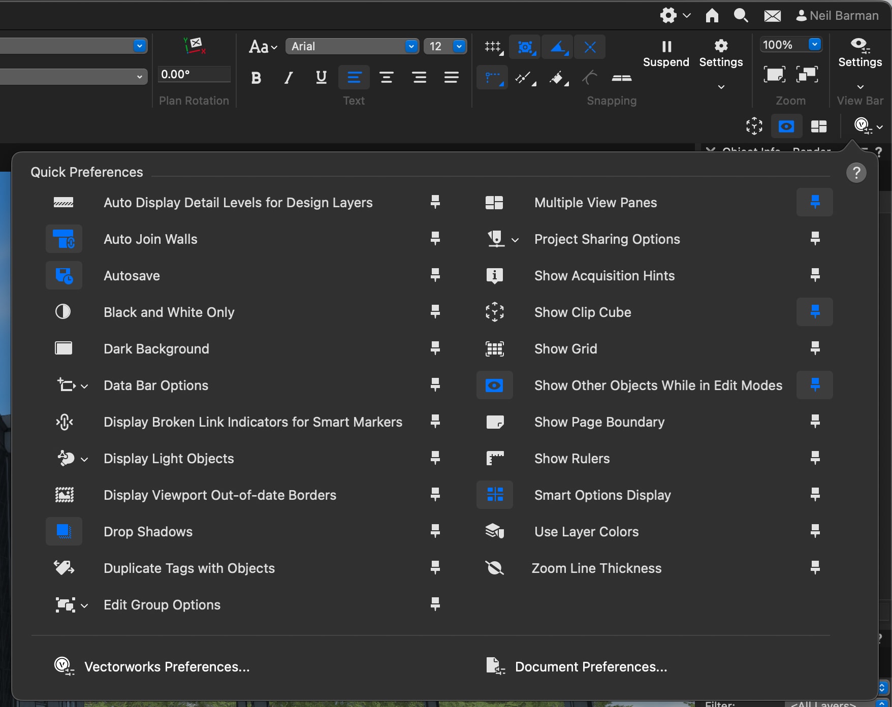 Another useful feature is Quick Preferences, which allows you to pin and unpin frequently used preference buttons on the Mode Bar. This gives you quick access to preferences that you often need to change. Additionally, you can toggle preferences on or off directly from the Quick Preferences setting pop-up, eliminating the need to navigate through Vectorworks Preferences. These customization options save you time and ensure a smooth and efficient workflow.
